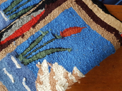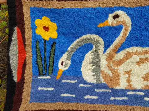BEAUTIFUL antique hand hooked rug with a lovely pair of swans. The colors are wonderful still vibrant, it was stored for many years, saving it from use and fading. The family stated it was a gift, saved and treasured circa 1920s.
